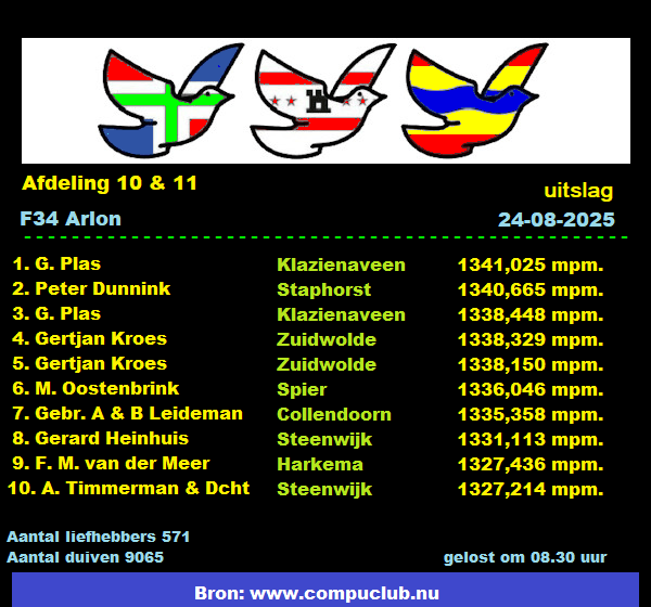 We zagen het aankomen het moest een keer gebeuren maar dat hij zo grandioos zou toe slaan met een 4e en 5e plek in gezamenlijke afdeling 10 & 11 vlucht Arlon tegen ruim 9000 duiven en bijna 600 liefhebbers is een groot feest in de club wel waart. We feliciteren Gertjan Kroes dan ook van harte met deze top prestatie. 1 en 2 in de club met op de derde plek Alphons Gasman die zich mooi revancheerde van de iets mindere vlucht vorige week. Klasse en applaus!!!