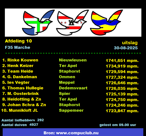De laatste kampioenen zijn ook bekend. Op de Natour werd Thomas zowel on als aangewezen kampioen, Alphons Gasman werd met zijn 4-4724463 kampioens duif Natour.