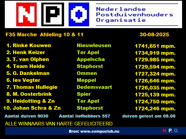 Top prestatie van Thomas Hullegie, die op de 1 na laatste jonge duiven vlucht Marche, een eerste en derde in de club, 6e afdeling en 7e in de sector wist te vliegen, Gertjan Kroes pakte een knappe 2e plek, gefeliciteerd!!