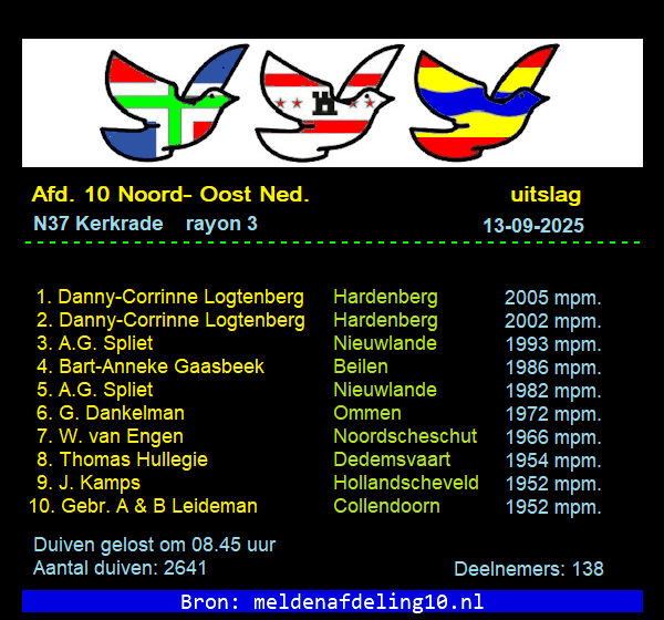 Super prestatie van het liefdes koppel Corrinne Rook en Danny Logtenberg, Niet alleen 1 en 2 op de eerste jonge duivenvlucht Gennep, maar ook winst op de Duitse kraker Hamm, oorspronkelijk Helmstedt maar door het slechte weer verplaatst. 3e jong werd Gert Jan Kroes. ook willen we deze topvliegers bedanken voor de sponsoring. Gert Jan met vleesbonnen op de jonge duivenvlucht en Danny en Corrinne met een blanco check op de Belgen competitie. Super!!! Alphons Gasman won de piekenpot jong, gefeliciteerd!!!